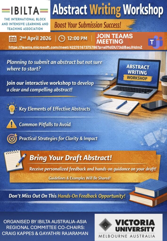 The Block and Intensive Teaching Community are invited to join us online on March 30th at 3:30 pm (US Mountain Standard Time) for a workshop on abstract writing in preparation for the online IBILTA conference (September 2026).